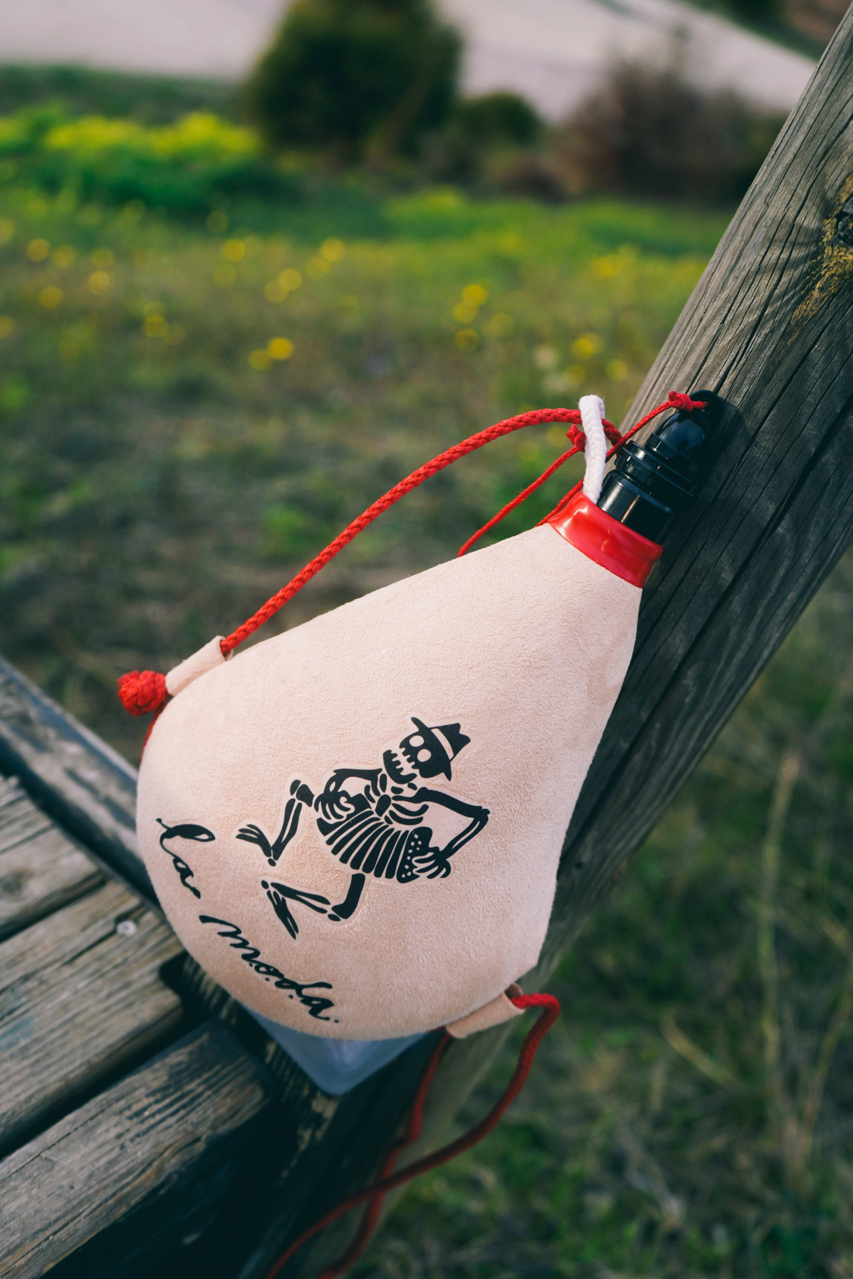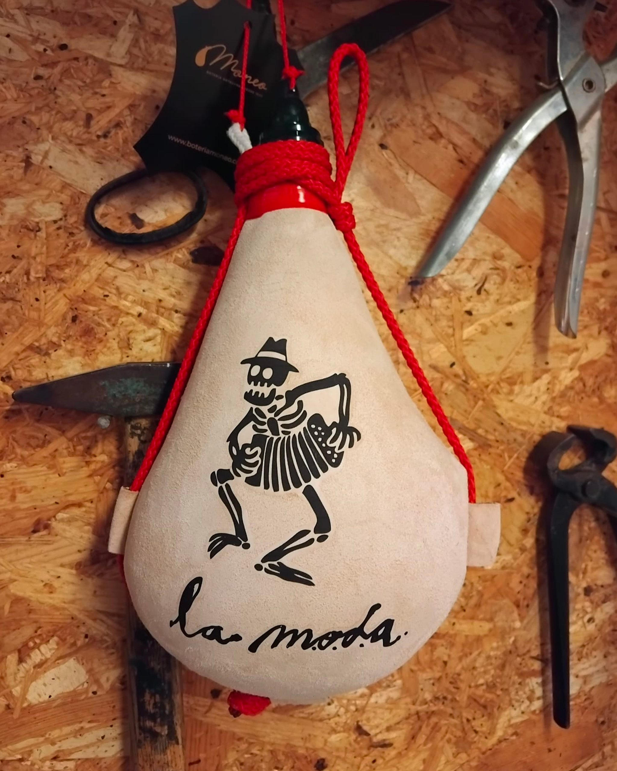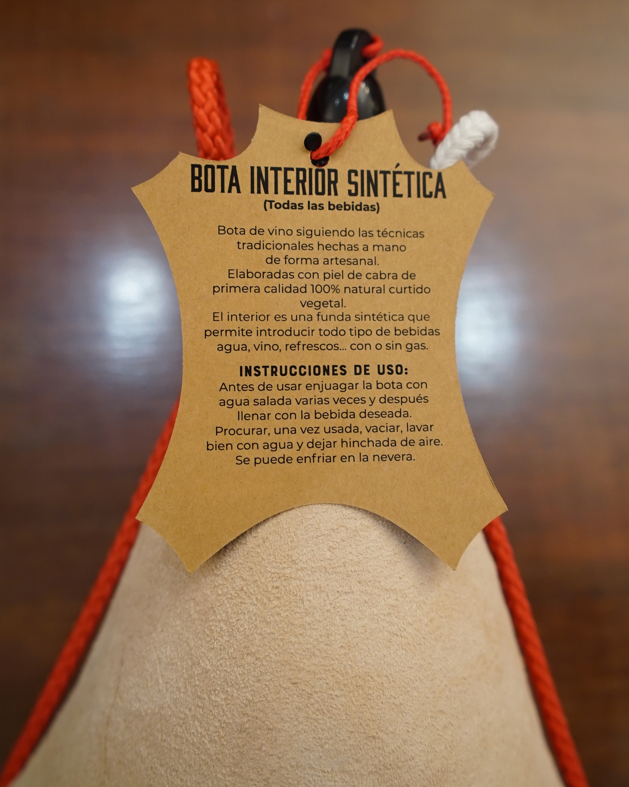 Bota con interior sintética (todas las bebidas) siguiendo las técnicas tradicionales, con exterior de piel de cabra, hechas a mano de forma artesanal por Botería Moneo en Covarrubias (Burgos).